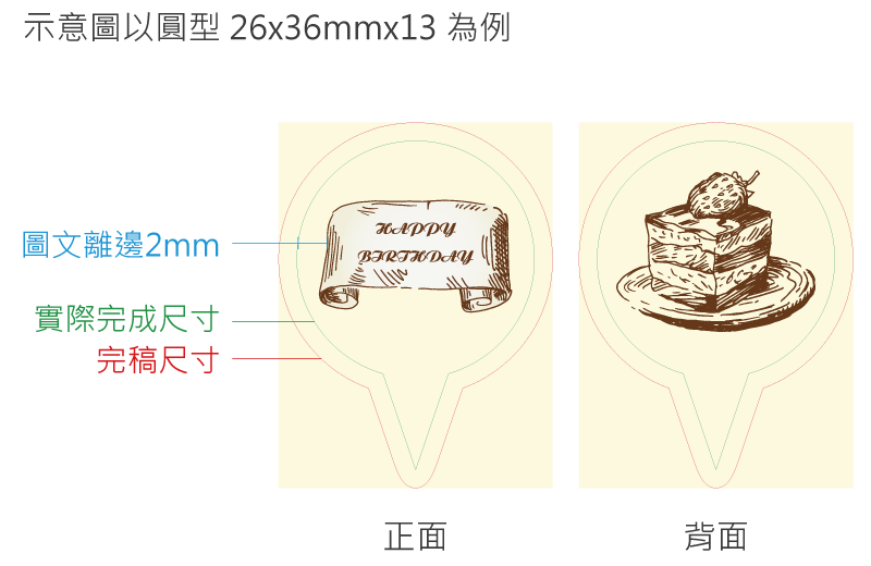 - 製作造型蛋糕標籤時,重要圖文請勿太靠近綠色框線,建議距離2mm以上(或距離出血框4mm以上),以免裁切誤差造成圖文被裁切。