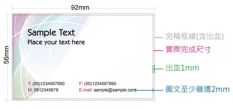 - 製作名片時,重要圖文請勿太靠近紅色框線,建議距離2mm以上(或距離出血框4mm以上),以免裁切誤差造成圖文被裁切。