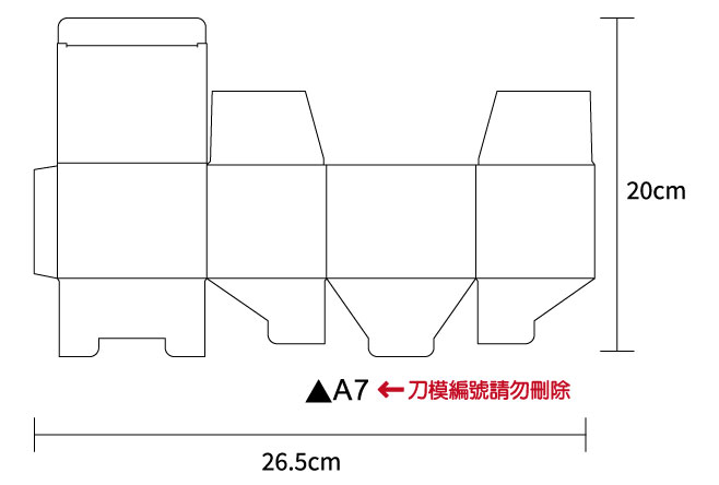 印刷費用計算方式 彩盒刀模線最長邊x最寬邊的外緣構成的範圍 下圖:寬26.5cmx長20cm=530cm² 則請參考級距501-750cm²的價格 |