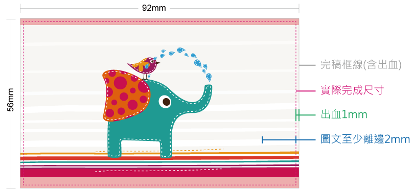 - 貼紙製作標準尺寸為90x54mm,檔案製作出血為92x56mm。