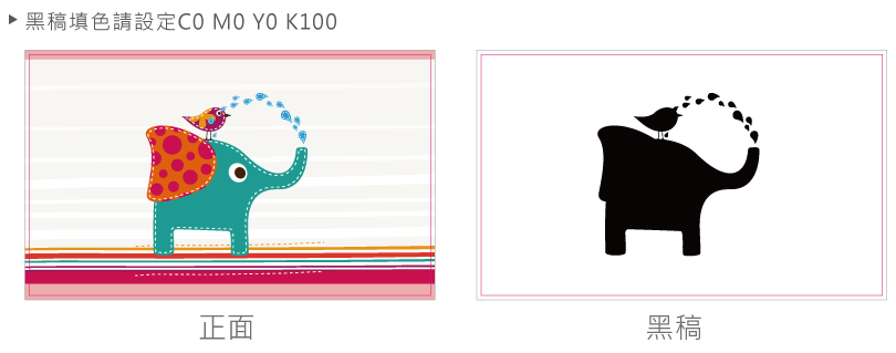 - 貼紙印刷時,請勿使用四色黑的填色,或四色總值超過200%以上的填色,以免油墨慢乾造成背印的情況。底圖填色也請勿低於8%,否則顏色太淺無法印出。