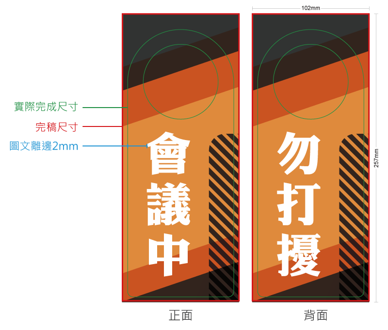 - 製作房門掛牌時,重要圖文請勿太靠近綠色框線,建議距離2mm以上(或距離出血框4mm以上),以免裁切誤差造成圖文被裁切。