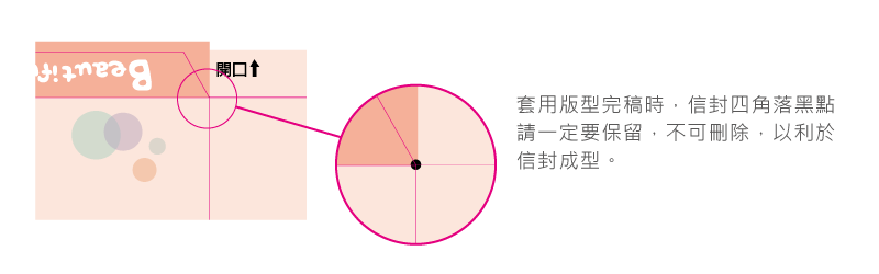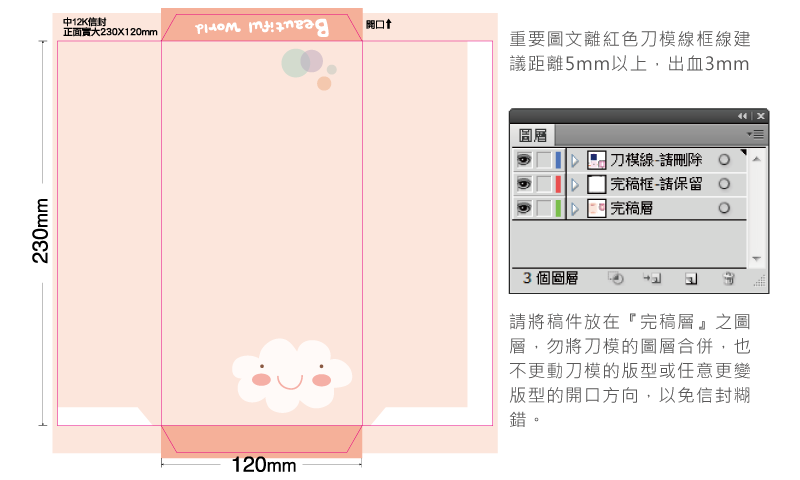 - 雙面膠彩色信封刀模有3個圖層:刀模線 / 完稿框 / 完稿層,重要圖文請勿太靠近紅色刀模線框線,建議距離5mm以上,以免裁切/摺紙誤差造成圖文不如預期。