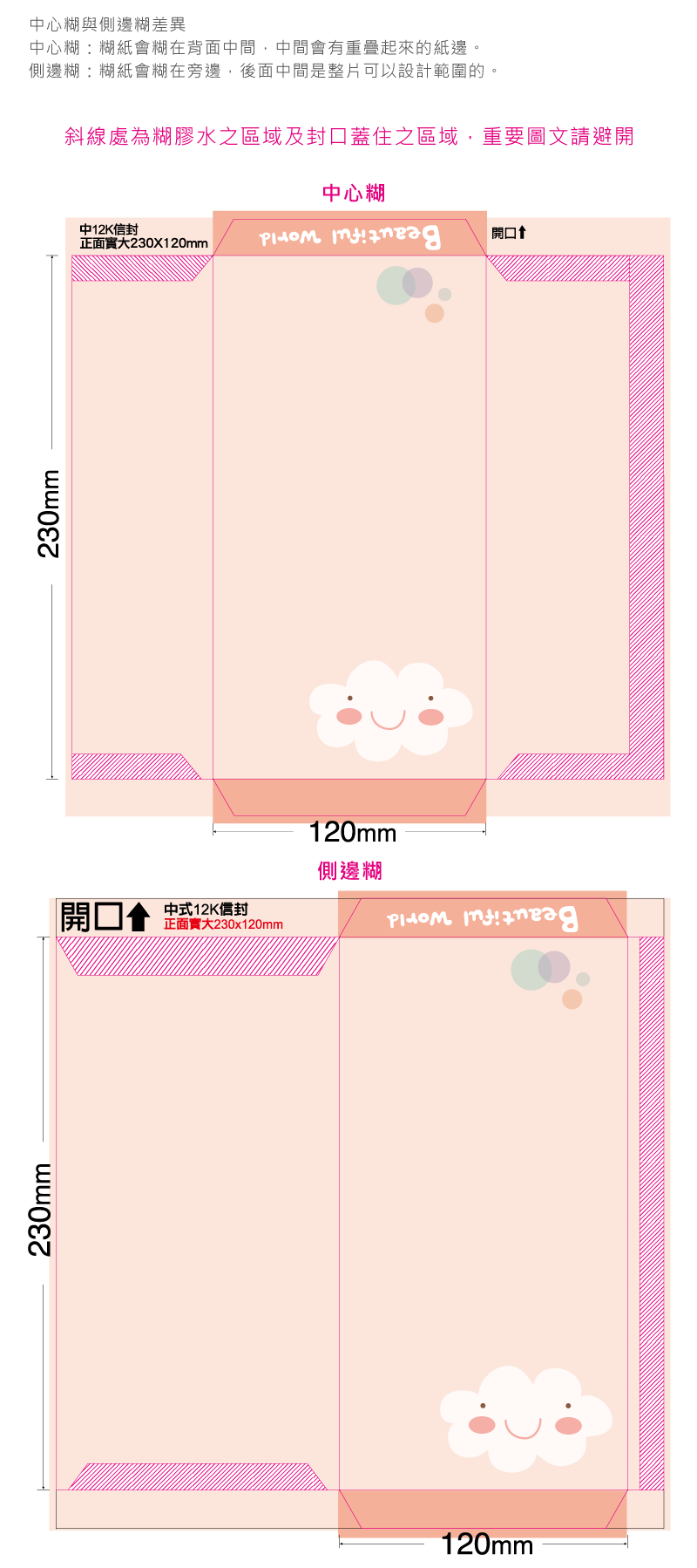 - 雙面膠彩色信封製作檔案時,AI及Cdr檔案文字皆須轉曲線或建立外框字,PS製作請將圖層平面化。請清除不需要用到的文字雜點,避免出現掉字或印出不明文字的問題。