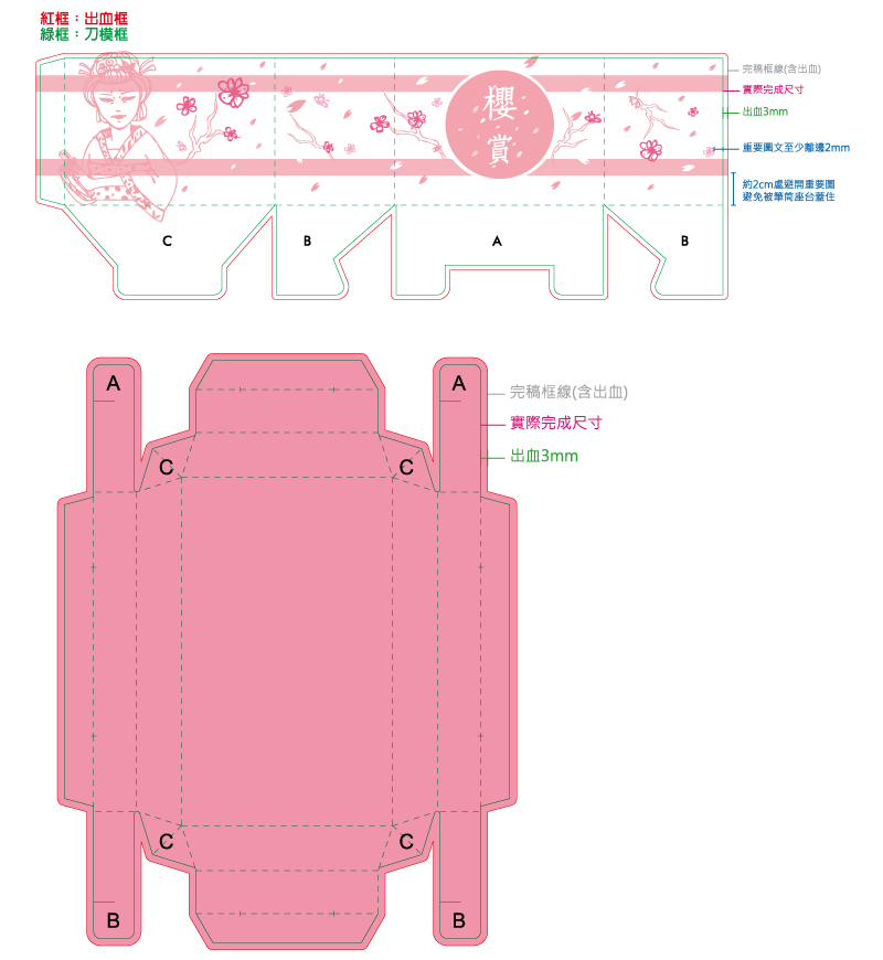 - 二格筆筒製作時,重要圖文請勿太靠近綠色框線,建議距離2mm以上(或距離出血框5mm以上),以免裁切誤差造成圖文被裁切。筆筒外箱約有2cm會被筆筒座台蓋住,重要圖文請避開。