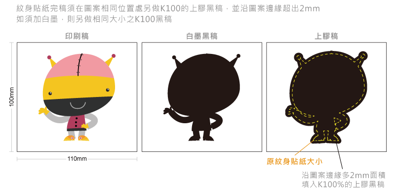 - 紋身貼紙完稿須在圖案相同位置處另做K100的上膠黑稿,並沿圖案邊緣超出2mm,以利製作紋身效果,如須加白墨,則另作相同大小之K100黑稿。