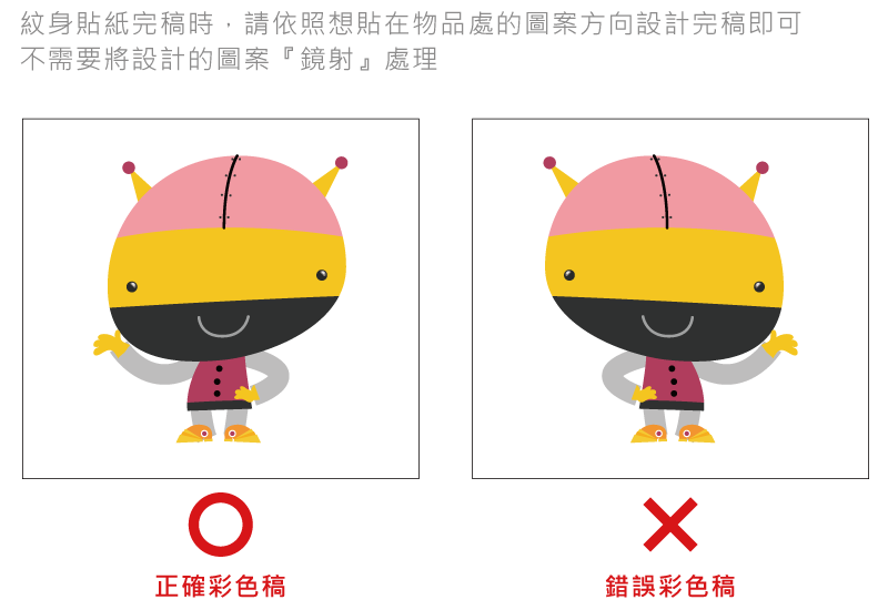 - 紋身貼紙完稿時,請依照想貼在物品處的圖案方向設計完稿即可,不需要將設計的圖案『鏡射』處理。