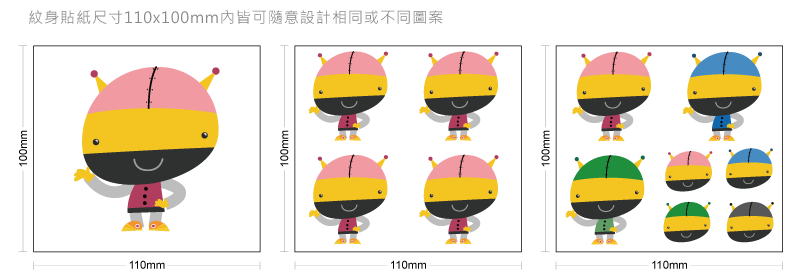 - 紋身貼紙尺寸110x100mm內皆可隨意設計相同或不同圖案。